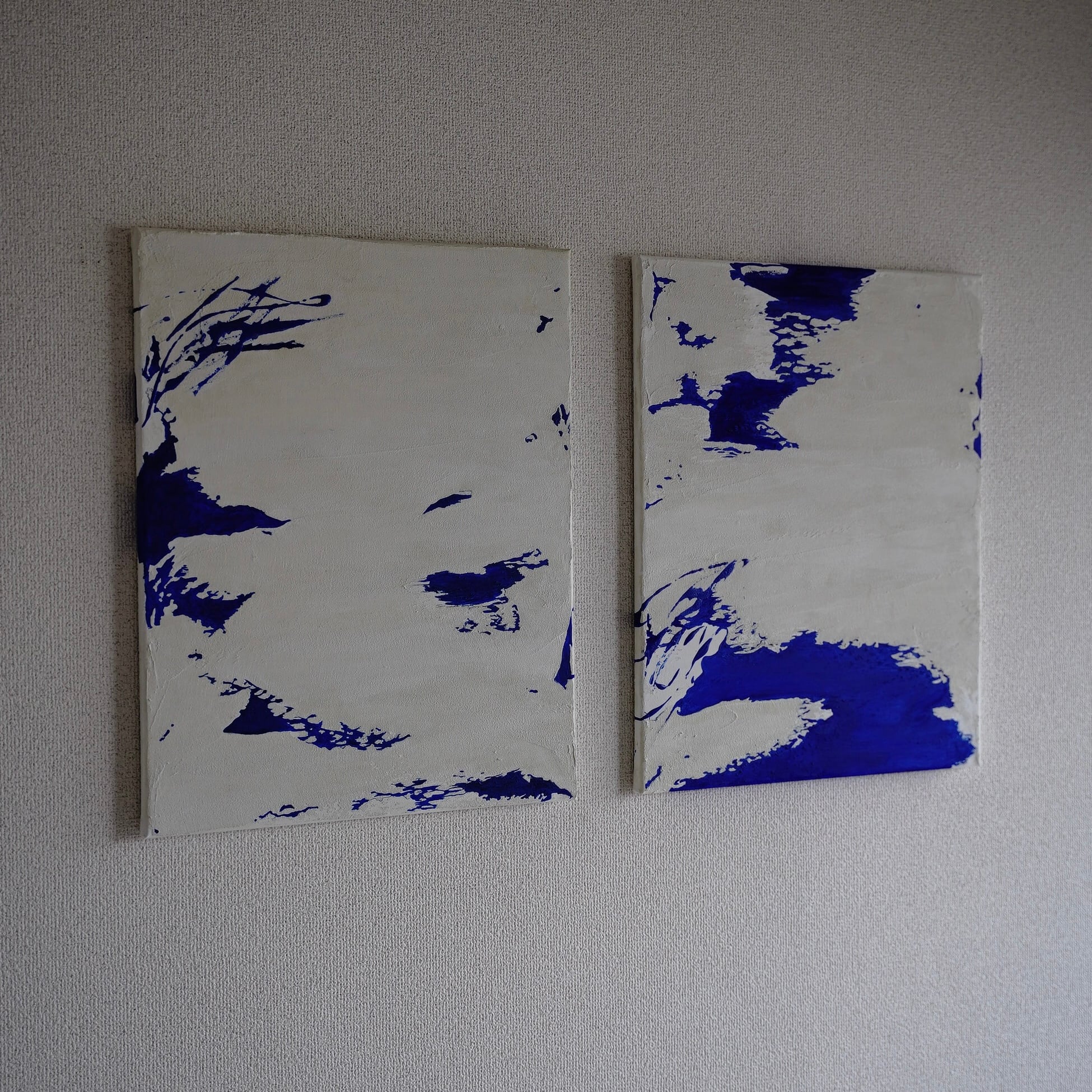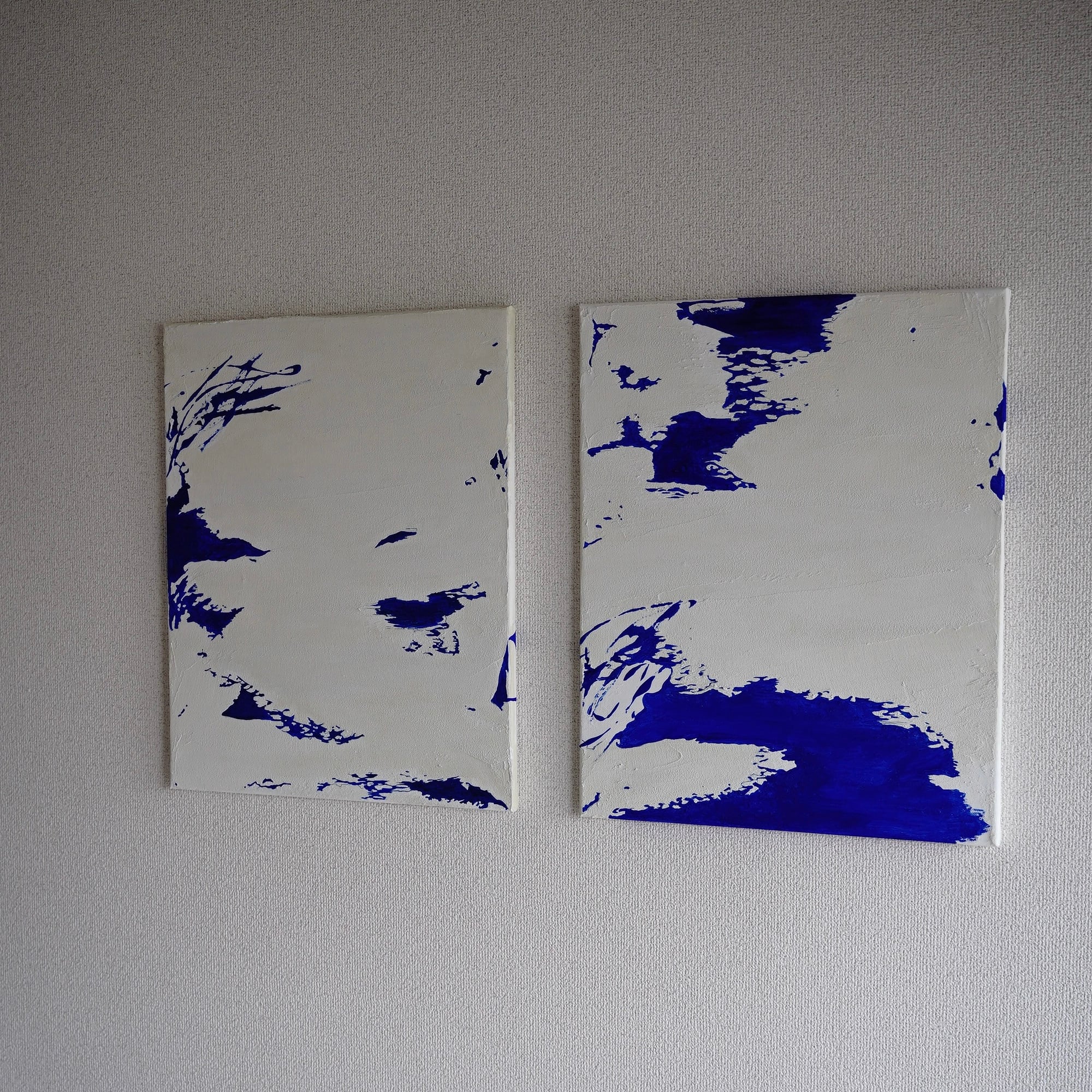 静謐な「白」の世界を、一点の迷いもない鮮烈な「ブルー」が駆け抜けます。ダイナミズムをそのままキャンバスに閉じ込めました。