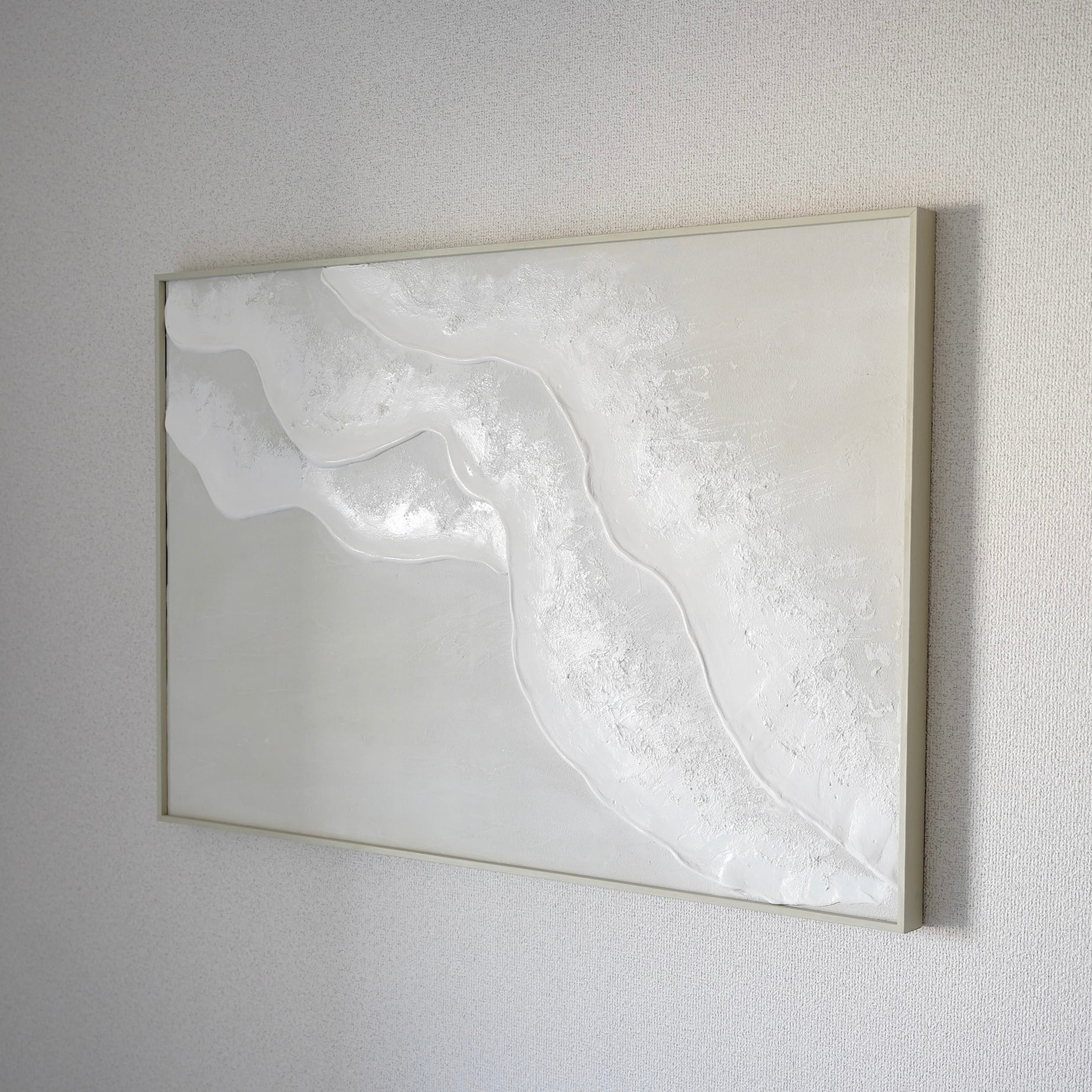 縦長の絵 海の絵 石膏アート 波の絵 モダンアート 北欧インテリア キャンバスアート インテリア テクスチャーアート ホワイトテクスチャーアート アートパネル モダンアートミニマルアート 白い部屋 白いインテリア アートギャラリー 白い絵 額装 ミクストメディア
